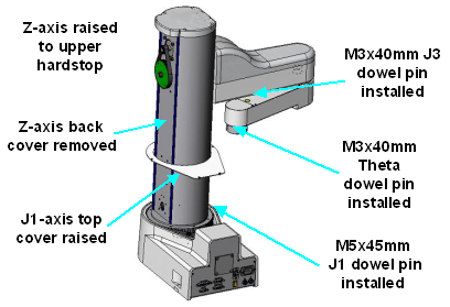 If your robot is equipped with a Theta axis, insert one of the supplied M3x40 mm dowel pins into the hole on the Theta flange. Rotate the flange until the pin registers with a slot in the outer link. This should center the flange within its range of travel. |