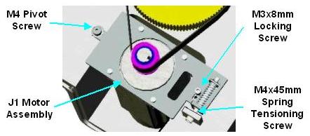 Detach the J1 Motor Assembly by removing the M4x45 mm Spring Tensioning Screw and the M4 Pivot Screw; and by unplugging the J1 motor and encoder cables at the controller in the Controls Bay. |